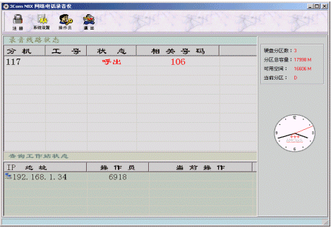 錄音坐席為網音公司開發(fā)的基于3Com NBX wavphone的軟件電話,與pcXset功能基本相同,能實現(xiàn)外撥、應答、掛機、電話會議、呼叫轉移、呼叫保持等常用功能。