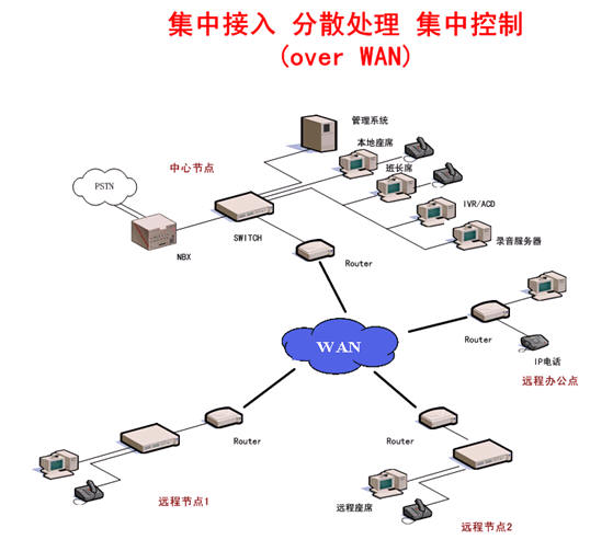 VoIP 技術(shù)與呼叫中心的結(jié)合,不僅僅讓用戶享受到Internet帶來的大量話費(fèi)的節(jié)約,更使基于Internet連接的分布式呼叫中心成為可能。分布式的呼叫中心系統(tǒng),集中式的管理,才能真正滿足那些擁有多個分支機(jī)構(gòu)的行業(yè)和企業(yè)用戶建設(shè)呼叫中心的需求;贗P分布式的NBX呼叫中心平臺支持遠(yuǎn)端坐席,利用現(xiàn)有的企業(yè)專線實(shí)現(xiàn)分布呼叫,同時簡化管理,由于人工坐席技能差異、語言差異、呼叫量的差異,以及客戶中心客戶所在地的變化及每個客戶對各自所擁有的用戶資料的保密性需求,分布式呼叫中心往往更適合各類企業(yè)的實(shí)際。分布式呼叫中心的建立,意味著需要在多個分中心之間進(jìn)行統(tǒng)一的呼叫控制及語音與同步數(shù)據(jù)轉(zhuǎn)移。NBX作為IP-PBX的引入,兩網(wǎng)合一的特性使分布式呼叫中心的建立成為了一件非常容易的事情。呼叫中心可以擴(kuò)展到多個位于不同地域的局域網(wǎng)上,通過路由選擇可以自動地把呼叫(語音)和數(shù)據(jù)從一個地點(diǎn)轉(zhuǎn)到另一個地點(diǎn)中心,因為語音數(shù)據(jù)通過同一網(wǎng)絡(luò),語音和數(shù)據(jù)同步轉(zhuǎn)移是很自然的。由于數(shù)據(jù)和語音全部通過以太網(wǎng)傳輸,所以不用支付昂貴的長途話費(fèi),降低了企業(yè)及客戶的開銷,同時由于各分支機(jī)構(gòu)可將各自的客戶資料保存在各分中心,這樣不僅大大降低了呼叫中心對數(shù)據(jù)庫的維護(hù)管理工作,也節(jié)約了設(shè)備投入及運(yùn)營維護(hù)成本。