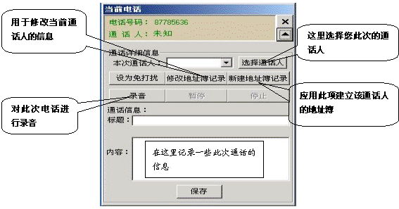 如果有電話打入時,在屏幕的右側(cè)會彈出一個對話框,它顯示了當(dāng)前來電的號碼和通話人(如果在地址簿中沒有記錄則顯示為未知),點擊彈出全部菜單功能,它相當(dāng)于一個功能強大的通話記事本,用它既可以邊接聽電話邊整理相關(guān)通話的文字記錄,又可以錄下通話的全部內(nèi)容。如果這個電話是您不愿接聽的,也可以將它設(shè)置為“免打擾”,這樣,這個號碼以后將存入免打擾名單中,若此號碼再呼入,系統(tǒng)將自動掛斷此呼叫。如果這個電話是您認為的重要客戶打過來的,您也可以將此號碼添加到重要客戶組中,以便您今后接聽或設(shè)置電話轉(zhuǎn)移時能與其它呼入電話相區(qū)分。