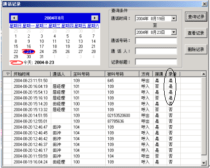 當(dāng)您在接打電話(huà)時(shí),可以利用 NBX-TCA對(duì)當(dāng)前的通話(huà)進(jìn)行錄音,以方便您對(duì)重要信息的記錄和查找。您可以在通話(huà)記錄中對(duì)已錄音的記錄進(jìn)行查找,如下圖所示。打開(kāi)通話(huà)記錄,選擇按錄音查找方式查看已有的錄音即可。