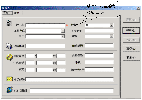 在地址簿中按鼠標(biāo)右鍵,在彈出的菜單中選擇“新鍵地址簿記錄”選項(xiàng),就會(huì)彈出新建聯(lián)系人對(duì)話(huà)框,在這里添入相應(yīng)的內(nèi)容,您的一個(gè)新用戶(hù)通訊錄就建立完畢了。