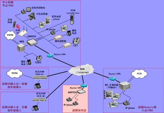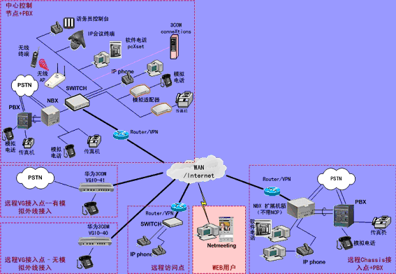 ③.遠(yuǎn)程接入的辦公室不再需要專(zhuān)用的 PBX, 只需要將3Com NBX電話(huà)終端接入到WAN網(wǎng)中,就能地實(shí)現(xiàn)在WAN或Internet上與3Com