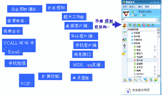 UcSTAR:Unified Communication Star,是擎旗技術(shù)研發(fā)的統(tǒng)一通訊平臺,它為企業(yè)提供多種通訊手段(企業(yè)即時(shí)通信、視頻、語音、郵件、短信、電話、MSN/QQ互通等),并可融合企業(yè)的各種應(yīng)用系統(tǒng)(OA、ERP、CRM、網(wǎng)站、電子商務(wù)系統(tǒng)等);將企業(yè)對外溝通、銷售和服務(wù)、對內(nèi)溝通和協(xié)作無縫整合;輕松實(shí)現(xiàn)無地域/時(shí)間限制的,可管理、可控制、可擴(kuò)展的,集內(nèi)外部溝通、服務(wù)和銷售一體化的統(tǒng)一工作平臺。此外,它也可被分離應(yīng)用為企業(yè)IM及實(shí)時(shí)協(xié)作系統(tǒng)、多媒體呼叫中心系統(tǒng)、專業(yè)級的IP視頻會(huì)議系統(tǒng)等。