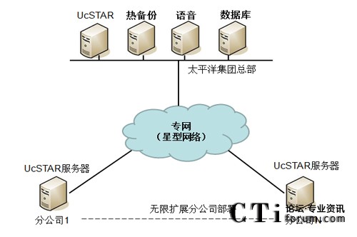 通過UcSTAR統(tǒng)一通信系統(tǒng)實現(xiàn)以公司總部為主的星型架構(gòu)的通信系統(tǒng)部署,實現(xiàn)集團內(nèi)部的溝通與協(xié)作應(yīng)用。