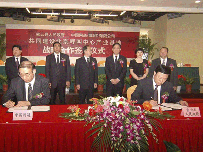 簽約儀式在密云瑞海姆田園度假村舉行,雙方就共建北京呼叫中心產業(yè)基地項目簽訂了《共同建設北京呼叫中心產業(yè)基地戰(zhàn)略合作協(xié)議》,北京市副市長茍仲文同志、中國網(wǎng)通(集團)有限公司董事長兼總裁左迅生、副總裁姜正新,北京市發(fā)展改革委、規(guī)劃委等市政府相關部門、密云縣人民政府、中國網(wǎng)通(集團)有限公司以及多家新聞媒體共計100余人參加了儀式。