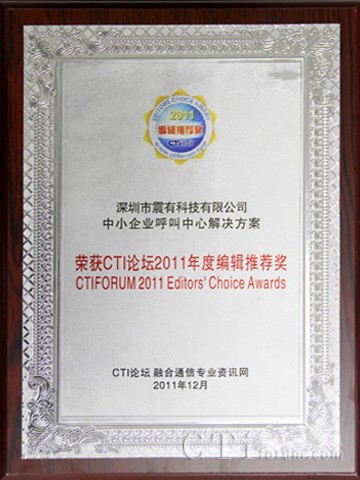 震有科技榮獲CTI論壇頒發(fā)的2011年度編輯推薦獎