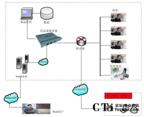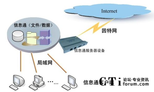 信息通系統(tǒng)的軟硬件部署,主要包括三個部分:信息通用戶工作平臺(客戶端)、信息通服務(wù)器(嵌入式設(shè)備)、數(shù)據(jù)/文件/管理服務(wù)器(其它應(yīng)用)。其中,在實際應(yīng)用中,信息通服務(wù)器與數(shù)據(jù)/文件服務(wù)器可以根據(jù)實際情況整合為一臺服務(wù)器。另外,整個系統(tǒng)通過應(yīng)用網(wǎng)關(guān)——信息通服務(wù)器設(shè)備——與Internet連接,所以,信息通服務(wù)器與應(yīng)用服務(wù)器為同一臺服務(wù)器。