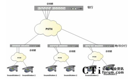 根據(jù)客戶需要在降低會議成本的前提下實現(xiàn)快速、便捷、實時的多點之間多人會議溝通的需求,我們制定了以下解決方案;系統(tǒng)利用傳統(tǒng)電話網(wǎng)絡(luò),是客戶擁有自己的會議管理系統(tǒng);省行方面使用Polycom SS2基本型商務(wù)會議電話或普通模擬電話;各個市/縣級分行,根據(jù)自己會場的情況自選設(shè)備。