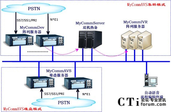 MyCOmmAVS集群模式:將三大核心模塊分布部署,其中MyCommServer核心模塊為雙機熱備,而MyCommDEV和MyCommIVR都設計為集群陣列方案。其優(yōu)勢的集中監(jiān)控和管理,DEV服務器和IVR服務器任何一個節(jié)點的故障都不影響其他系統。