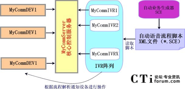 MyCommServer:核心控制服務器。實現對呼叫的控制,和管理DEV設備控制器和IVR流程解析器等周邊設備。