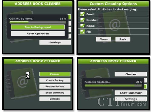 同事、同學(xué)、朋友、家人、客戶、合作伙伴…你的黑莓手機(jī)中存了多少聯(lián)系人了?其中又是否有重復(fù)存儲呢?一款名為Address Book Cleaner應(yīng)用,可以幫助你整理和合并黑莓手機(jī)中的重復(fù)聯(lián)系人信息。該應(yīng)用可設(shè)置按照重復(fù)姓名、號碼、電子郵件地址、PIN碼等進(jìn)行查重、合并和刪除,并可在整理結(jié)束后給出整理報告。同時,Address Book Cleaner還可以隨時隨地將通訊薄中的聯(lián)系人信息進(jìn)行備份和恢復(fù),可讓用戶在無法與PC的BlackBerry Desktop Manager連接的時候,也可以輕松進(jìn)行聯(lián)系人的備份和恢復(fù)操作。