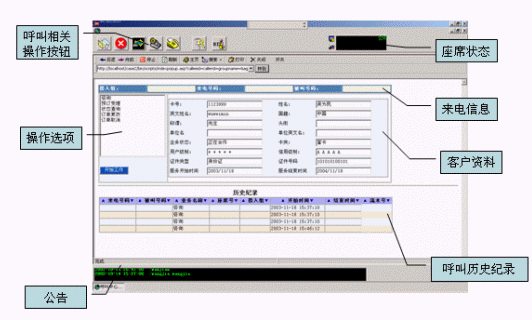 普通座席支持注冊、注銷、摘機、掛機、前處理、后處理、小休、取消小休、撥空閑座席、轉移IVR、呼叫保持、外撥、發(fā)起三方會議。班長席支持監(jiān)聽。