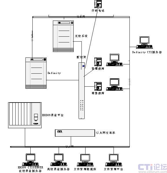 - HXD09 CTI服務(wù)器(在線錄音服務(wù)器):HXD09交換機(jī)系統(tǒng)服務(wù)器,開發(fā)平臺。完成系統(tǒng)部分控制,在線錄音等功能。