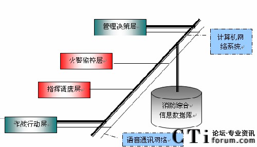 通過(guò)對(duì)消防安全監(jiān)控指揮中心業(yè)務(wù)的分析,引進(jìn)先進(jìn)的數(shù)據(jù)通信網(wǎng)絡(luò)和語(yǔ)音通訊網(wǎng)絡(luò),我們可以將未來(lái)的消防業(yè)務(wù)層次抽象地概括為四層(如圖所示):管理決策層、火警監(jiān)測(cè)層、指揮調(diào)度層和作戰(zhàn)行動(dòng)層。與管理決策層對(duì)應(yīng)的組織機(jī)構(gòu)為消防通信指揮中心;與火警檢測(cè)層、指揮調(diào)度層對(duì)應(yīng)包括消防指揮中心的接處警子系統(tǒng)、指揮調(diào)度等子系統(tǒng);與作戰(zhàn)行動(dòng)層對(duì)應(yīng)的組織機(jī)構(gòu)為消防站(消防隊(duì))和消防車及消防隊(duì)員。