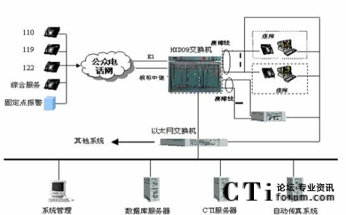 綜合接警平臺主要由hxd09可編程智能語音交換機和計算機網(wǎng)絡(luò)兩部分組成,交換機負責110、119、122報警電話的接入與分流及調(diào)度呼出等功能;計算機網(wǎng)絡(luò)則完成110、119、122報警信息的顯示、數(shù)據(jù)儲存、統(tǒng)計及信息查詢、發(fā)布功能。