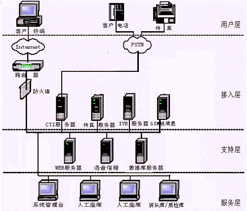 CTI服務器、IVR/FAX服務器、人工座席、管理工作站(計費、統(tǒng)計、系統(tǒng)管理、網(wǎng)絡管理)、數(shù)據(jù)庫服務器、WWW服務器、網(wǎng)絡系統(tǒng)等,其網(wǎng)絡結(jié)構(gòu)圖如下: