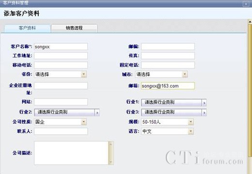 對(duì)新添加的客戶錄入客戶信息資料,包括客戶的名稱、郵箱等,為其建立起一個(gè)新的客戶關(guān)系,可以隨時(shí)找到該客戶的具體信息以及他的銷(xiāo)售情況,方便對(duì)客戶銷(xiāo)售進(jìn)程有一個(gè)充分地實(shí)時(shí)跟蹤,并為之更好地服務(wù)。