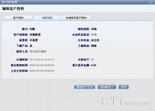 點(diǎn)擊標(biāo)簽選擇要查看的客戶資料,和銷(xiāo)售進(jìn)程。查看客戶日志能看到該客戶被執(zhí)行操作的歷史情況,例如資料的變更,所屬的變更等等。添加聯(lián)系人是指為當(dāng)前客戶添加新的聯(lián)系人,添加完聯(lián)系人信息后,聯(lián)系人就會(huì)被納入到該客戶資料里。