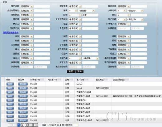 例如,以區(qū)域?yàn)闂l件進(jìn)行搜索,區(qū)域選擇北京后,點(diǎn)擊查詢,你想要的北京區(qū)域的客戶全部出現(xiàn)在客戶列表中。