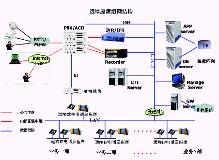 遠端座席組網(wǎng)方式中,中心點和遠端座席之間通過采用數(shù)字中繼(E1)連接的遠端模塊或采用數(shù)據(jù)網(wǎng)絡連接的IP電話方式。具體方式如下圖: