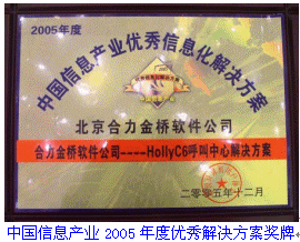 2006年1月10日,北京。中國計算機(jī)用戶協(xié)會"2005年度企業(yè)及產(chǎn)品頒獎典禮"在世紀(jì)金源大飯店隆重召開。在Call Center(呼叫中心)及CRM(客戶關(guān)系管理)領(lǐng)域位居業(yè)界領(lǐng)先地位的HOLLYCRM(合力金橋軟件)公司自主知識產(chǎn)權(quán)的HollyC6呼叫中心解決方案再度成為業(yè)界關(guān)注焦點,榮獲"中國信息產(chǎn)業(yè)2005年度優(yōu)秀解決方案"大獎。