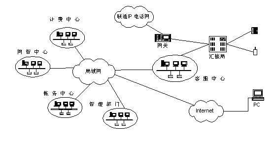 聯(lián)通北京分公司將客戶服務(wù)系統(tǒng)與現(xiàn)有計(jì)費(fèi)、營(yíng)業(yè)、帳務(wù)系統(tǒng)進(jìn)行組織,形成了一個(gè)有機(jī)的結(jié)合體,能夠充分發(fā)揮出現(xiàn)有系統(tǒng)的優(yōu)勢(shì)?蛻舴⻊(wù)系統(tǒng)從營(yíng)業(yè)帳務(wù)系統(tǒng)提取相關(guān)用戶資料,建立客戶服務(wù)的系統(tǒng)資料庫(kù),從計(jì)費(fèi)系統(tǒng)提取相關(guān)用戶話費(fèi)資料等供查詢使用。同時(shí)客服系統(tǒng)還將與北京聯(lián)通現(xiàn)有的計(jì)費(fèi)、營(yíng)業(yè)、帳務(wù)、網(wǎng)管等相關(guān)系統(tǒng)以及Internet相連,提供業(yè)務(wù)處理和用戶自助服務(wù)等業(yè)務(wù)。本客服中心通過(guò)2對(duì)路由器和DDN專線與聯(lián)通北京分公司現(xiàn)有的局域網(wǎng)(包括管理部門(mén)、網(wǎng)管中心、計(jì)費(fèi)中心、帳務(wù)中心等相關(guān)系統(tǒng))連接,并通過(guò)該局域網(wǎng)訪問(wèn)Internet。
