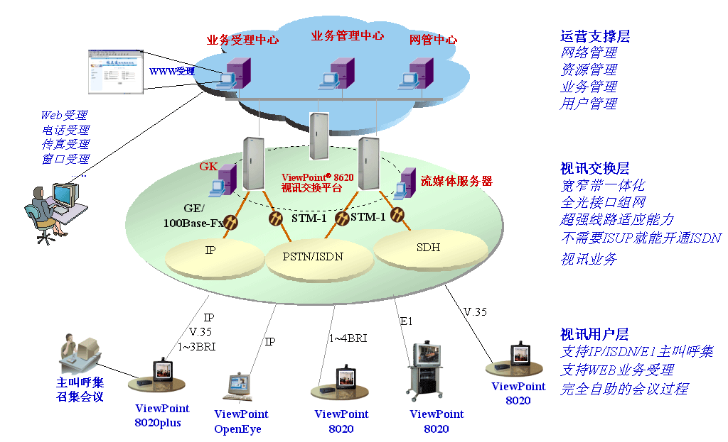 “視點(diǎn)通”ViewPoint®8000綜合視訊系統(tǒng)可以充分利用現(xiàn)有網(wǎng)絡(luò)資源,為網(wǎng)絡(luò)運(yùn)營(yíng)商提供完善的訊業(yè)務(wù)運(yùn)營(yíng)解決方案,使得視訊業(yè)務(wù)真正能夠廣泛服務(wù)于遠(yuǎn)程教學(xué)、企業(yè)會(huì)商、遠(yuǎn)程醫(yī)療、應(yīng)急通信、行政會(huì)議等領(lǐng)域,并逐步進(jìn)入千家萬(wàn)戶(hù)。