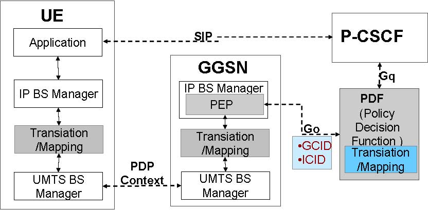 (3)PDF對(duì)IP流進(jìn)行記錄(包括流標(biāo)識(shí)符(GCID)、數(shù)據(jù)速率、QoS類(lèi)別等)并授權(quán)。通過(guò)SDP參數(shù)映射到所授權(quán)的IPQoS參數(shù)而實(shí)現(xiàn),并通過(guò)GO接口(COPS協(xié)議)傳送到GGSN。