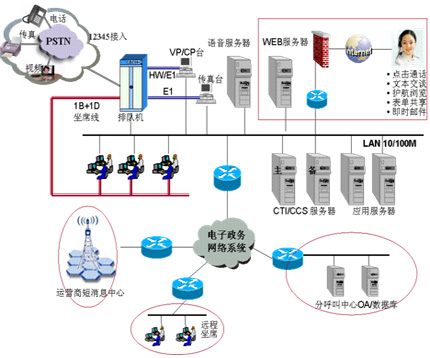 針對(duì)政府目前熱線(xiàn)電話(huà)眾多,管理不規(guī)范,資源無(wú)法共享的問(wèn)題,華為公司提出的基于資源整合理念的解決方案,采用華為公司呼叫中心技術(shù)構(gòu)建完整的計(jì)算機(jī)電信集成(CTI)系統(tǒng)體系,并充分利用政府現(xiàn)有的信息網(wǎng)絡(luò)資源,一方面整合原有分散的熱線(xiàn),啟用12345政府熱線(xiàn)號(hào)碼統(tǒng)一接入;另一方面將自動(dòng)語(yǔ)音查詢(xún)、人工服務(wù)、信息資料處理緊密結(jié)合起來(lái),依托地方政府各類(lèi)業(yè)務(wù)技術(shù)支持系統(tǒng)和網(wǎng)絡(luò)系統(tǒng),建立一套通暢的來(lái)電業(yè)務(wù)公文流轉(zhuǎn)系統(tǒng),通過(guò)人工受理或自動(dòng)語(yǔ)音服務(wù)等方式,為人民群眾提供全天候24小時(shí)不間斷的服務(wù)。最終整合現(xiàn)有的全部政府部門(mén)政府熱線(xiàn)資源,使政府政府熱線(xiàn)服務(wù)范圍覆蓋到政府公共服務(wù)的全部領(lǐng)域,為市民提供全方位、全天候、高效率的政府政府熱線(xiàn)服務(wù),市民只記一個(gè)電話(huà)號(hào)碼,只打一次電話(huà),就能得到政府答復(fù)和服務(wù)。