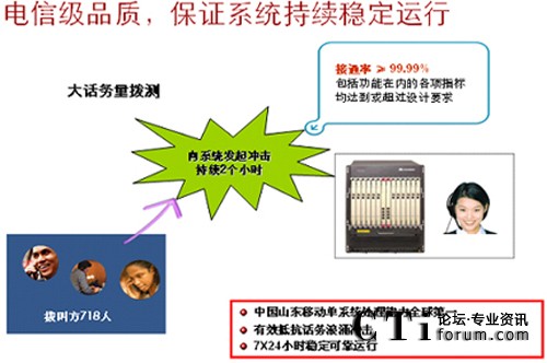 華為聯(lián)絡中心系統(tǒng)具有高穩(wěn)定性、高可靠性、易擴展性和可維護性。這主要源于華為對電信網(wǎng)絡現(xiàn)狀與演進的理解,源于華為擁有固定、移動和IP三個網(wǎng)絡方面綜合實力。華為數(shù)以千計的核心平臺開發(fā)測試人員,幾十種極端環(huán)境(如超大話務量、溫差、濕度、鹽堿度、缺氧等),磨礪出的是世界級的高品質(zhì)。麥加朝圣10KM內(nèi)密集200萬移動用戶,大部分為國際漫游,整齊劃一的用戶行為,形成連日多波話務尖峰,網(wǎng)絡受不均衡沖擊,系統(tǒng)容易雪崩。使用華為方案STC連續(xù)四年征服HAJJ期間話務高峰,告別系統(tǒng)每逢朝圣就癱瘓歷史。正是繼承了這樣的DNA,我們在某移動運營商聯(lián)絡中心系統(tǒng)單點實測BHCC1200K,每天平均呼叫量為600萬次,一套系統(tǒng)支撐著2000多座席和近8000路IVR。