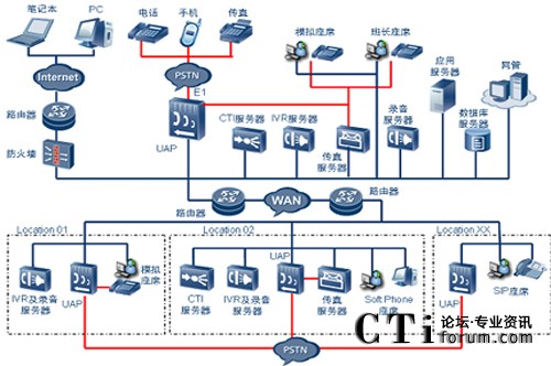 華為多媒體聯(lián)絡中心提供完善的分布式組網(wǎng)及集中式組網(wǎng)功能,可以提供分布式接入、分布式IVR、分布式錄音系統(tǒng)、分布式坐席、分布式傳真系統(tǒng)及網(wǎng)絡呼叫中心技術。如果各個分支機構(gòu)有較多本地化業(yè)務需求的時候,各個分支機構(gòu)只需要再配置一臺CTI服務器,就可以升級成完整的聯(lián)絡中心系統(tǒng),可以單獨開展豐富的個性化業(yè)務。如果總部再安裝一套網(wǎng)絡呼叫中心,則可以實現(xiàn)聯(lián)絡中心的互連,即網(wǎng)絡呼叫中心。