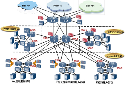 根據(jù)業(yè)務(wù)需要,在不同分區(qū)的匯聚交換機(S9306)上合理部署負載均衡和防火墻單板,來有效支撐相應(yīng)的服務(wù)器群的業(yè)務(wù)展開需要;在核心的匯聚交換機(S9312)上也配置防火墻單板為不同的功能分區(qū)間的流量進行有效控制。