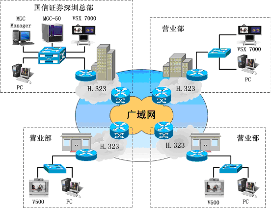 國(guó)信證券有限責(zé)任公司為全國(guó)性大型綜合類(lèi)證券公司,總部在深圳,在全國(guó)二十一個(gè)城市擁有二十多家營(yíng)業(yè)部及服務(wù)網(wǎng)點(diǎn)。隨著國(guó)信證券規(guī)模的不斷擴(kuò)大和內(nèi)外交流的增加,公司領(lǐng)導(dǎo)希望借助視頻會(huì)議的高效、快捷等特點(diǎn),提高管理效率、統(tǒng)一管理、降低企業(yè)的管理運(yùn)作成本、減少公司的巨額通訊費(fèi)用和差旅費(fèi)用。