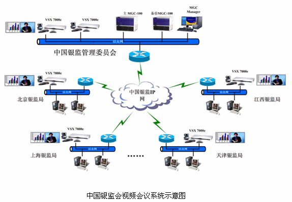 中國銀監(jiān)會目前已經(jīng)擁有一個高速、高可靠性的ATM骨干傳輸網(wǎng)絡(luò),網(wǎng)絡(luò)采用星形結(jié)構(gòu),各分支機(jī)構(gòu)到北京總部的線路均為2條15M ATM線路,這種優(yōu)良的網(wǎng)絡(luò)非常適合視頻會議業(yè)務(wù)的運(yùn)營。視頻會議網(wǎng)建立完成后可以實(shí)現(xiàn)通過遠(yuǎn)程視頻會議,遠(yuǎn)程處理重點(diǎn)銀行業(yè)金融機(jī)構(gòu)監(jiān)事會的日常管理工作;遠(yuǎn)程審查銀行業(yè)金融機(jī)構(gòu)高級管理人員任職資格;遠(yuǎn)程討論協(xié)商制定有關(guān)銀行業(yè)金融機(jī)構(gòu)監(jiān)管的規(guī)章制度和辦法;遠(yuǎn)程對銀行業(yè)金融機(jī)構(gòu)實(shí)監(jiān)管,依法對違法違規(guī)行為進(jìn)行查處;更加可以通過遠(yuǎn)程雙流會議,按照國家有關(guān)規(guī)定,遠(yuǎn)程公布全國銀行數(shù)據(jù)、報(bào)表。