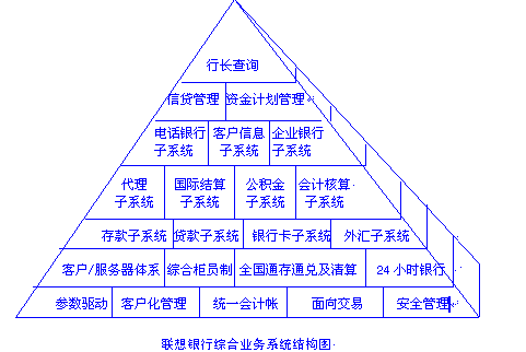 聯(lián)想銀行綜合業(yè)務系統(tǒng)以客戶管理為中心,采取面向交易的設計,實現(xiàn)了綜合柜員制,集中體現(xiàn)了大會計思想,提高了銀行的辦公效率,改善了服務形象,實現(xiàn)了全行的統(tǒng)一管理;