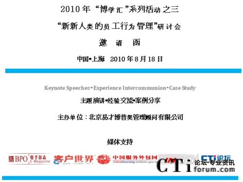 宣傳廣泛:除了易才博普奧《電子雜志》外,我們還與《呼叫中心觀察網(wǎng)》、《客戶世界》、《CTI論壇》、《中國(guó)服務(wù)外包網(wǎng)》等專業(yè)權(quán)威媒體充分合作,在會(huì)前、會(huì)后對(duì)本次大會(huì)進(jìn)行廣泛宣傳和報(bào)道。