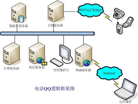 電話QQ系統(tǒng)主要由CTI服務(wù)器、數(shù)據(jù)庫服務(wù)器、計(jì)費(fèi)服務(wù)器、短信服務(wù)器、管理維護(hù)臺和Web服務(wù)器組成。