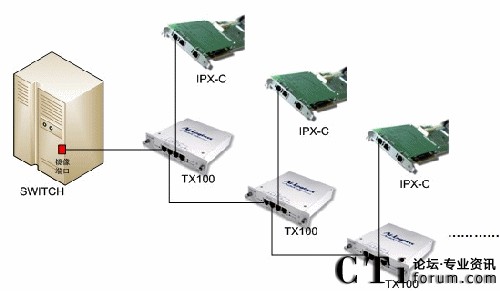 將PBX或網(wǎng)絡(luò)Switch的鏡像端口連接到TX100的Network口,另一個(gè)Network口和Monitor A就可將一個(gè)端口的數(shù)據(jù)備份成兩個(gè)端口的數(shù)據(jù),實(shí)現(xiàn)了一分二的功能。若再接一個(gè)TX100,就可以繼續(xù)分用,以此類推,根據(jù)各個(gè)IP應(yīng)用中實(shí)際所需的備份/分用,TX100都可以予以實(shí)現(xiàn)。