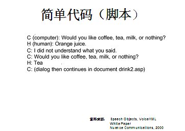 世界上最古老的用戶界面--人類語(yǔ)言終于在二十一世紀(jì)借助于VoiceXML,一種語(yǔ)音可擴(kuò)展標(biāo)記語(yǔ)言發(fā)展成熟起來(lái)。作為世界上第一個(gè)真正的語(yǔ)音通信標(biāo)準(zhǔn),它定義了應(yīng)用開(kāi)發(fā)商向用戶提供新型信息訪問(wèn)服務(wù)的方式。通過(guò)這種服務(wù),用戶在任何地方,都可以通過(guò)電話或任何移動(dòng)設(shè)備,虛擬訪問(wèn)任何信息。VoiceXML正在被廣泛應(yīng)用于旅游、金融與信息服務(wù)等行業(yè)的各種業(yè)務(wù)領(lǐng)域中,甚至是政府部門(mén)與市政機(jī)構(gòu),全球的無(wú)線運(yùn)營(yíng)商等。