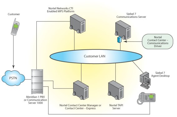 客戶、PSTN、北電網(wǎng)絡(luò)支持CTI的MPS平臺(tái)、Siebel7通信服務(wù)器、北電聯(lián)絡(luò)中心通信驅(qū)動(dòng)器、客戶LAN、Meridian 1