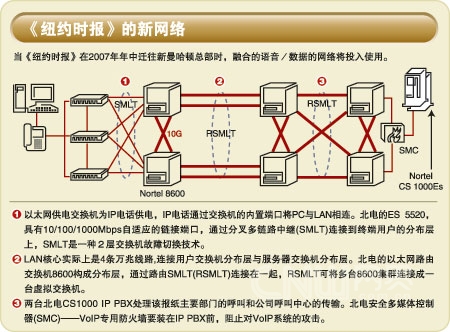 VoIP架構(gòu)是基于北電的通信服務(wù)器CS 1000平臺,該平臺是一種基于服務(wù)器的IP PBX。CS 1000是基于北電的Meridian PBX特性集合,其主機(jī)運(yùn)行在一臺來自WindRiver系統(tǒng)公司的VxWorks實時操作系統(tǒng)的IP服務(wù)器上。一對冗余的CS1000將為新聞、廣告、發(fā)行和其他部門中大約3600 部IP電話以及部署在《紐約時報》的分類/顯示廣告呼叫中心的300部IP軟電話提供服務(wù)。CS 1000提供對34臺以上的媒體網(wǎng)關(guān)和18臺信令服務(wù)器(部署在網(wǎng)絡(luò)中為內(nèi)網(wǎng)連接的不同部門提供VoIP呼叫建立和信令的分布式專用設(shè)備)的集中管理。
