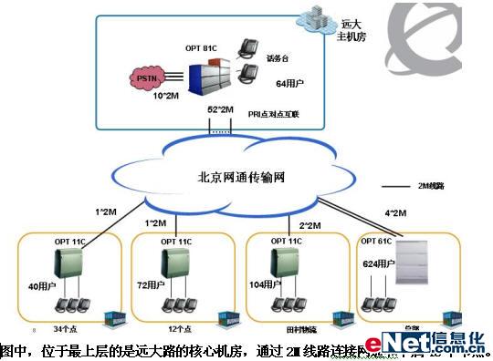 新的網(wǎng)絡(luò)建成以遠(yuǎn)大路中心機(jī)房為核心的星形網(wǎng)絡(luò),租用北京網(wǎng)通2M專線的方式同各個(gè)門市店連接。各個(gè)門市店設(shè)立了自己的程控交換機(jī),并通過E1中繼方式和核心機(jī)房實(shí)現(xiàn)全網(wǎng)互聯(lián)。在此方案中,所有的市話呼入和呼出都通過核心節(jié)點(diǎn)同網(wǎng)通之間的中繼通道,從而實(shí)現(xiàn)大中電器內(nèi)部話音通訊的統(tǒng)一編號方案、統(tǒng)一撥號規(guī)則、統(tǒng)一維護(hù)和管理;并對外公布公開和便于記憶的號碼,以配合網(wǎng)點(diǎn)的促銷活動,以及未來客戶服務(wù)等應(yīng)用的擴(kuò)展。
