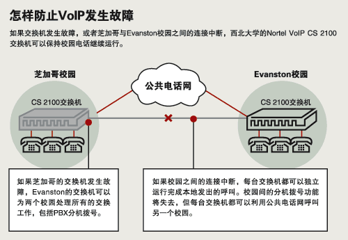 美國西北大學原來的兩臺運營商級SL-100電話交換機(一臺安裝在芝加哥校園,一臺安裝在Evanston校園)已經(jīng)用了差不多20年。升級的目標是將兩臺獨立的交換機合并為一臺邏輯交換機來減少管理復雜性。同時,不必更換全部數(shù)字電話。最終他們決定升級到同時支持VoIP和TDM的Nortel CS 2100 VoIP,這樣用戶不用被迫把他們的電話換為VoIP電話。Carr說:“不管是那些希望利用VoIP性能的用戶,還是想繼續(xù)使用當前電話特性和服務的用戶,可以各取所需。”