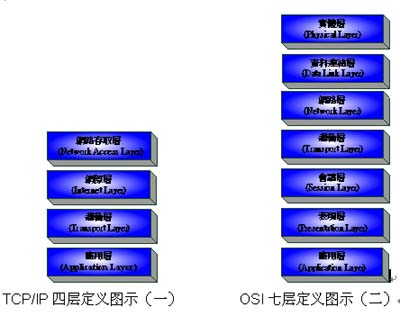 Standard Organization)所制定的標(biāo)準(zhǔn), 下面三層偏硬件,上面三層偏軟件,中間一層偏軟件硬件間的溝通。兩種標(biāo)準(zhǔn)協(xié)議圖(一)和圖(二)來作簡(jiǎn)單說明.