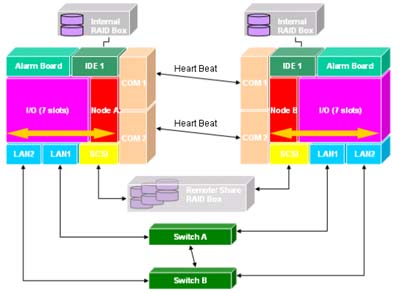 在網(wǎng)絡(luò)方面,上圖的兩臺(tái)CompactPCI系統(tǒng)各有兩個(gè)LAN,分別可透過Switch經(jīng)由防火墻連接到外部網(wǎng)絡(luò)。兩個(gè)Switch之間有網(wǎng)絡(luò)連通,且每個(gè)系統(tǒng)至少有兩個(gè)LAN可維持系統(tǒng)的網(wǎng)絡(luò)通暢。