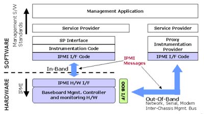 - 管理軟件:系統(tǒng)管理者最常接觸的就是上層的管理軟件,簡單的類型就是使用一般的終端機(Terminal)程序來接收從Serial/Modem所傳送過來的文字訊息。近年來,除了BMC廠商會有自行開發(fā)的上層管理軟件外,也有不少的軟件廠商加入了開發(fā)管理軟件的行列,而他們最主要利用的溝通界面即為網(wǎng)絡(luò)界面。不管是通過序列或是網(wǎng)絡(luò),在界面上傳輸?shù)亩际荁MC所能辨認(rèn)的IPMI訊息。