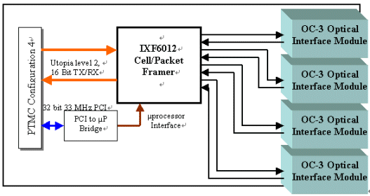 在這個(gè)例子中,Utopia總線是封包傳輸?shù)闹饕獢?shù)據(jù)傳輸路徑,PCI總線是用來(lái)設(shè)定與控制IXF6012,透過(guò)使用了PTMC,設(shè)計(jì)工程師可提供各種連接到網(wǎng)絡(luò)處理器的實(shí)體層更多彈性。