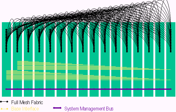 PICMG 3.0包含多種傳輸,這些傳輸模式如圖由下而上依序提供系統(tǒng)管理層、控制層、資料層等的聯(lián)接。系統(tǒng)管理是基于一條與各槽位都相連的I2C 雙串行信號線, 系統(tǒng)管理信息則是基于IPMI規(guī)范被擴展到在PICMG3.0規(guī)范中使用。系統(tǒng)管理總線也是冗余方式確保在一條總線故障情況下,管理信息仍正常傳遞。在資料層旁邊的控制層稱作Base 接口 (Base Interface),Base接口是一個雙星型的拓撲結構具有冗余的交換刀片和以太網(wǎng)BAST-T信號,在PICMG 3.0中提供IP傳輸,這點在架構定義上非常像PICMG 2.16。PICMG 3.0單板的高速數(shù)據(jù)傳輸是通過Fabric接口 (Fabric Interface),F(xiàn)abric接口是基于3.125Gbps SERDES信號,可以在星型和全網(wǎng)狀結構中支持10Gb的傳輸速率。正如上面提到的,PICMG 3.0核心規(guī)范定義了Fabric接口的信號和互聯(lián),而輔助規(guī)范定義了用于傳輸?shù)膮f(xié)議。PICMG 3.0 背板的互聯(lián)支持全網(wǎng)狀Fabric接口,雙星型Base接口和冗余的系統(tǒng)管理,如下圖所示: