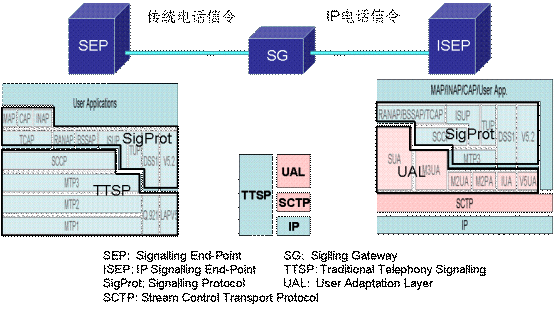 圖中粉紅色部分為SIGTRAN的協(xié)議棧,在它們之上的是對(duì)應(yīng)的電話(huà)信令協(xié)議。SIGTRAN的協(xié)議棧分為2層:一層是SCTP,它提供多個(gè)流的,可靠的數(shù)據(jù)傳輸,用戶(hù)數(shù)據(jù)的捆綁和分段,阻塞和流量控制,防止"拒絕服務(wù)"和"偽裝"的攻擊等功能。另一層是用戶(hù)適配層,圖中由SUA、M3UA、M2UA、M2PA、IUA和V5UA五個(gè)適配模塊所組成,它們分別來(lái)滿(mǎn)足各種電話(huà)信令協(xié)議適配的要求。