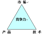 企業(yè)要發(fā)展, 關(guān)鍵于企業(yè)的核心競爭力, 企業(yè)如何具有核心競爭力, 特別是通信企業(yè), 我認(rèn)為, 通信企業(yè)要具有核心競爭力, 決定于三個因素: 市場, 產(chǎn)品, 技術(shù). 這三個因素構(gòu)筑企業(yè)強(qiáng)大競爭力---競爭力三角型. 三角型的邊則是產(chǎn)品經(jīng)理的活動軌道. 圖1-1